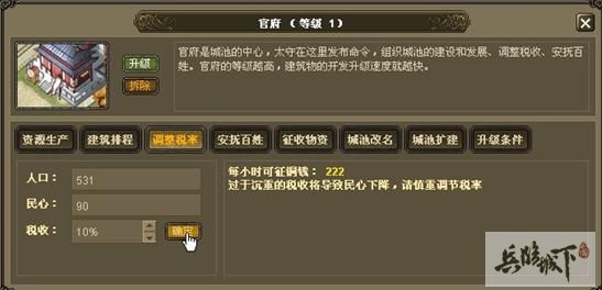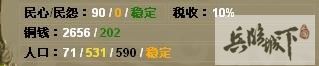 你可以通过**进行税率的调节,注意高的税率会为你短时间带来较多的铜钱收入,但会导致民心下降,人口的流失,所以请谨慎调控!