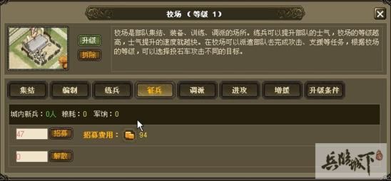 只有装备上各种军械才能上战场打仗。军械通过兵器铺、防具铺、车马间生产,但只有在大学殿研究出相应的科技才能生产。在武将军事界面先配置好军械,然后在校场你就能编制新兵了!
