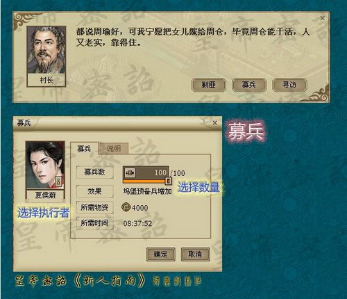 如果运气好,寻访到了武将,那就多一个人来建造资源了。本菜鸟比较心急,想快点打仗啊,于是再找村长去募兵了。主将是有10名兵的,主要用来搬运物资,打仗么就不要浪费这些兵。招完兵记得训练和编制,把招募的兵士放到选定的部将下面。