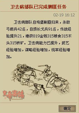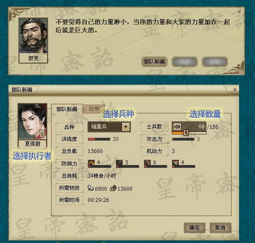 为了将预备兵编制成为具备工作能力的部队,要使用到部队新编功能。在校场的鼓吏以及中军帐的传令兵那里,可以使用部队新编功能。选择新部队的兵种数量 部队长(必须是未担任部队长并无其他正在执行任务的武将)以后,花费一定的资源和时间,新部队就编制成功了。