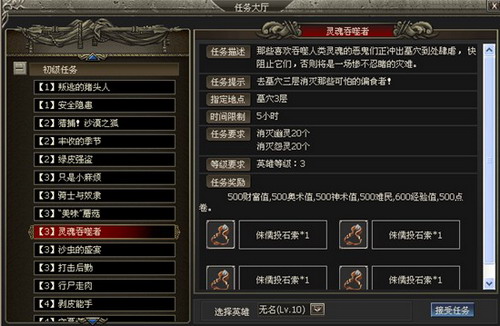 在去地下城之前,你最好先在任务大厅接受英雄任务。因为新手岛同时拥有4种不同的地下城,所以不用担心找不到任务要求的地下城,你可以将所有地下城一层的相关任务都完成。不过需要注意的是,由于英雄任务每天只能被完成一次,所以最好先让主英雄完成。