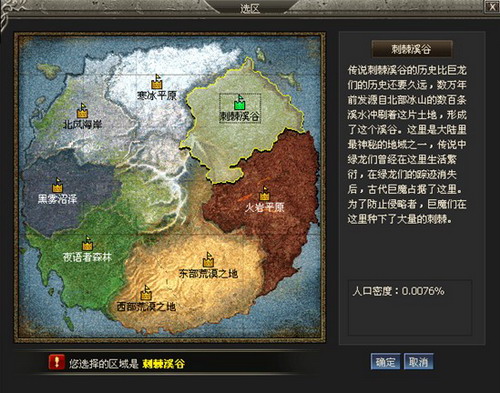 随着新手任务一步步的完成,很快就到了告别新手岛的时候了。现在你可以按照自己的喜好自由选择大陆上的一个区域定居,选择的时候你可以清楚的看到当前区域的人口密度。立志成为大狼的玩家就选择人口密度高的区域吧,投身那个战火纷飞的地方;想种种田的玩家还是选择人口密度低的区域吧,至少周围对你有觊觎之心的玩家会少些。
