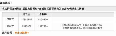 6月19日晚,攻城战爆发。被恶魔雄霸已久的主城遭到了如潮水般的人类联军攻击,恶魔势力节节败退。随机攻城阶段结束,转而进入到防守阶段。防守阶段更加精彩,因为这个是联盟之间的战斗,谁将夺取服务器首个主城?这个是联盟实力的体现,是联盟凝聚力的体现,是盟主战略指挥的体现,也是联盟荣耀的体现!
