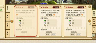 接着,我们用同样的方式,建造矿洞、梯田、宿舍、林场……依次完成‘资源建设’、‘住房问题’、‘升级林场’、‘升级资源’、‘兴建仓库’、‘招兵买马’6个任务。