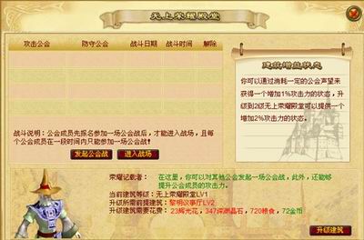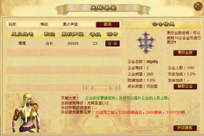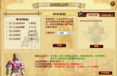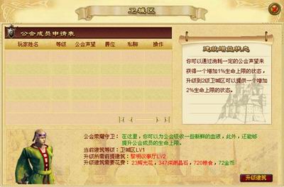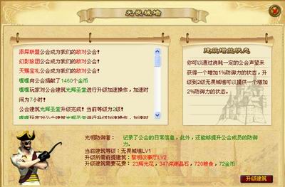 2通过城市里面的公会入口进入自己的公会,公会建筑有卫城区,神秘禁地,无畏城墙,.神秘埋宝地,黎明议事厅,无上荣耀殿堂,光辉殿堂,曙光图书馆组成。刚建立的公会卫城区,光辉殿堂,神秘埋宝地是一级的,其他建筑是0级的,升级建筑物有前提建筑等级的限制