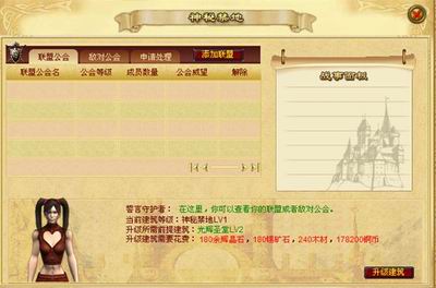 神秘禁地:升级受到光辉殿堂等级的限制,这里可以查看联盟或者敌对公会。此建筑最高可以升5级
