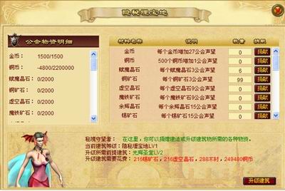公会建筑的升级,消耗大量的材料和金钱,要靠全体会员一起努力捐献材料,建筑升级后,公会就越强大,会员得到的属性效果就越大