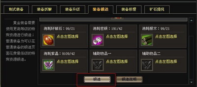 普通装备打造:普通装备打造是不能用带等级的特殊资源,就是普通资源的用来打造。打造出来的基本属性是随机的。