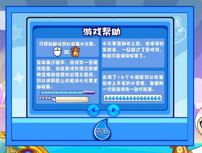画面的右下角有蓝色的魔法能量框和红色的吸收水资源框。小勇士在收集水元素的过程中,会储存一些魔法能量,当能量储存满之后使用空格键会释放出强大魔法,可以将界面上的魔法水元素全部收集。