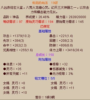 三、神器分为:简陋、普通、精良、完美、传说五种品质。通过提升神器基础属性的总成长来提升神器的品质。神器品质越高,神器拥有的附加属性项数、附加属性类型、铭纹栏位越多。