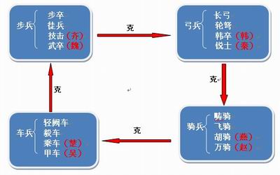 谋略类游戏最核心的乐趣自然是体现在攻城掠地、派兵打仗上,《战国春秋》中21个兵种,都有轻重型,分属步、骑、车、弓4个兵科,在游戏中,兵种有相克关系,步兵克弓兵,弓兵克骑兵,骑兵克车兵,车兵克步兵,国家特殊兵种也是如此,即对应关系如下: