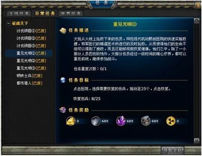 任务分为主线任务、日常任务、世界任务,主线任务主要是通过建造士兵,恢复伤员,攻打一定兵力的野地来完成;日常任务则是每天都可以完成,完成后也可以获得不少的声望和资源奖励,包括捐资源、建造士兵,提升兵力完成;而世界任务,则是关于捐献资源、购买商品的方式完成。