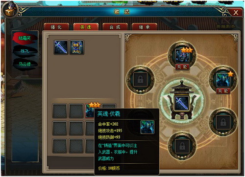 武器和衣服强化到第四大等级后,每提升一个大等级 ,开放一个注魂孔,每个孔可以注入一个英魂。
