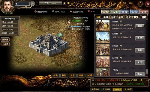 你可以点击屏幕右侧上方的“内政”,然后会看到“巡查”(增长人口上限)、“开垦”(提升粮食产量)、“商业”(提高库银税收)、“人口”(增加人口增长速度)等选项,鼠标左键点击你所需要发展的功能按钮,并指派武将负责,即可执行。一般执行时间为5分钟。根据执行武将的能力不同,执行的效果也有差别。