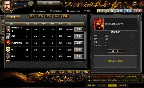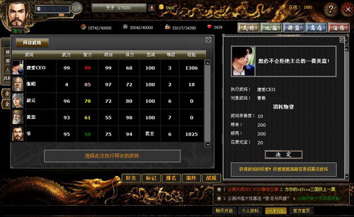打开“人才”栏目中的登庸选项,你就会看到一批可以马上用元宝招揽的武将列表。如果你是个新玩家,此时手里正攥着注册时系统送的500元宝,那就别犹豫了,挑选几个物美价廉的武将马上收到帐下吧!