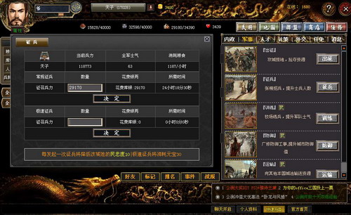 如果要募集士兵,你可以点击“军事”中的“征兵”按钮,征兵界面就将出现在屏幕的左侧,各项条件和数据一目了然。当然,征兵除了会消耗人口之外,也是要花费库银的,所以在征兵之前,记得先稳定经济,保证有足够的银两哦。