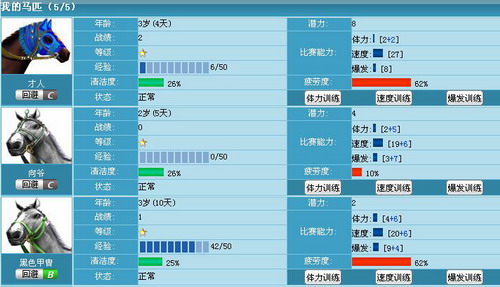 每次训练结束后,马匹都会增加相应的疲劳度和训练休息时间,具体不同方式、不同强度的训练将给马匹带来疲劳度和需要休息的时间,在游戏中选择训练时即可看见。大家可以根据自己的需要比较选择,适当训练!