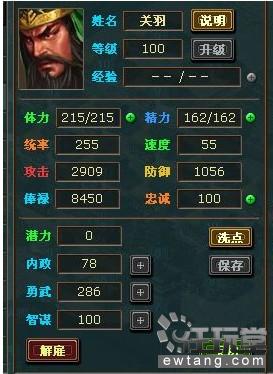 先来具体介绍一下具体的操作流程,此战役共分二部分:第一部分是占领清近身兵;第二部分是掠夺清所有的兵。由于关羽当时吃了三宝,现在没有截到当时的图,这是平时的属性图
