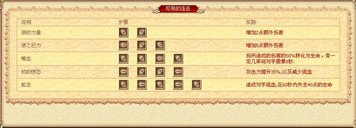 当然,使用这些技能的前提是你要把这些技能的组合给测试出来,之后就可以随意使用了!比如1-2级的两招就比较适合前期破防用,适用于所有装备。而嗜血与豹的愤怒比较适合攻击型装备,如刽子手和黄昏套装,而蛇击则是对抗防御姿态最好的连击技,而且还可叠加!