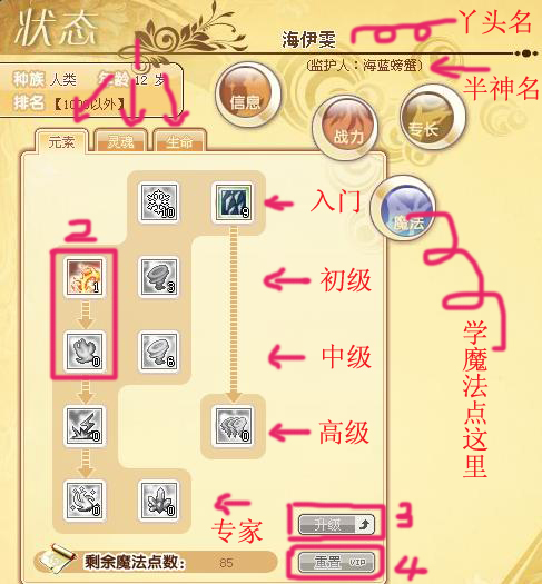 如图所示:在1所示的位置,有三个标签页,分别对应三系魔法:元素、灵魂、生命。而每一系都各有五行,分别是入门、初级、中级、高级、专家。