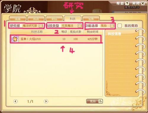 选择学院,点科技标签,这样就可以进入学院研究界面。1是选择部门;2是该部门下的科技类型;3是功能(研究或是拍卖)。具体说来,就是在学院内研究某些科技,当科技成功研究出来后,将其竞拍,竞拍时间一到,价高者得。这时你的物品中【消耗品】一栏就会有该技能的强化书。这里有几个地方需要具体说明一下: