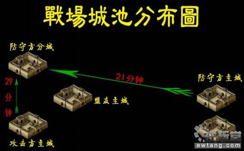 就在宣战者侦查盟主城池的时候,盟主已经使用了一个“空城计”:攻击方侦查的结果只有实际兵力的十分之一!就在攻击方侦查开始的时候,盟主已经把其他的分城的兵力向这个拳头城调过来,攻击方的掠夺的部队是27分钟到达,而盟主的部队在驿站是9级的情况下是21分钟集合完毕!