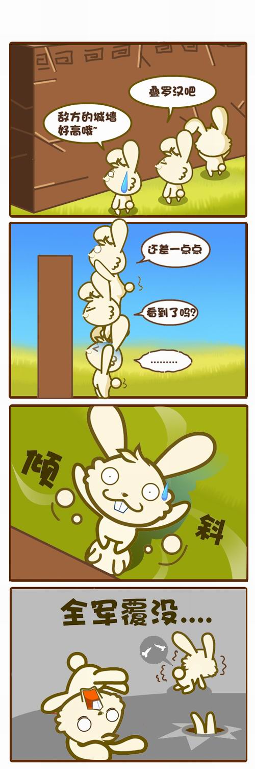 于是,其中比较聪明的一个兔子想出了叠罗汉的方法(正所谓三人行必有诸葛亮),他们分工合作,开始登城任务,结果却发生了一个史无前例的重大不幸: