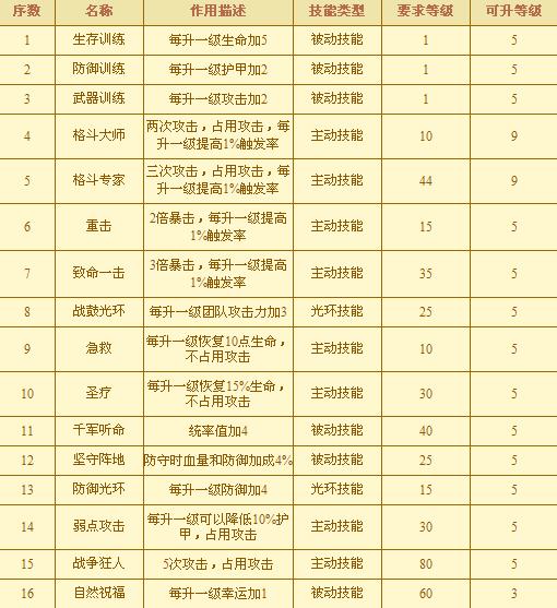 ·耐力:增加英雄生命值和编队内兵种的生命值和驻守时“鉴定大师”和“训导大师”技能的强度