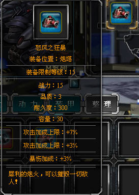 装备在炮塔上的部件“狂风之狂暴”共有三条属性,主要的固定属性为增加攻击加成上限百分比,目前见过最高+7%。