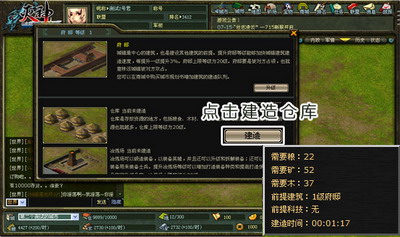 在府邸点击建造仓库,仓库是保存资源的地方,只有仓库有余量,资源才会不断上升.