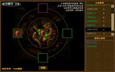 小编在这里说明一下,游戏里初始合成的成功几率为25%,每增加一颗参与合成的灵石,几率提升25%,只有把上方的空格用上“合成符”,成功几率才会到达100%。一旦合成失败,灵石可是会降级,1级灵石就会消失(所以想要进行合成的玩家们可要掂量一下是否有合成的必要,必须要合成的物品就不要犹豫了,一定要用上“合成符”)。
