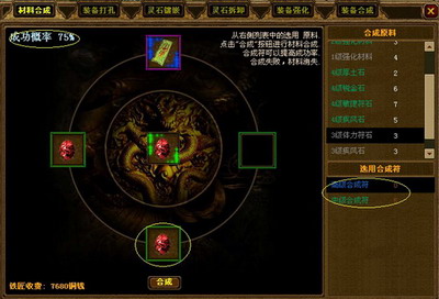 在上面的“材料合成”界面我们可以看到,当把想要合成的灵石放到合成空格中,中间的空格是想要合成的灵石种类,左、右、下三个空格必须放同一级别的同种灵石,并且要消耗一定的铜钱才能进行“合成”的操作。