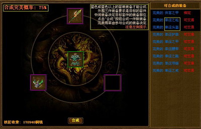正如图片中显示,中间的空格是合成目标套装的部位,外围必须是同一系列的套装装备,并且外围必须要至少有一件装备参与合成,参与合成的所有装备必须都是没有镶嵌灵石的。参与合成的装备品质越高,合成完美的几率就会越大,当三件合成装备都是完美的时候,合成装备完美的概率就会达到100%。合成结束后参与合成的装备就会消失,合成装备没有失败设定,只有品质优劣之分(所以合完之后就不要找GM要回装备啦)再次强调!装备合成是可以解除装备“绑定”效果的!(喜欢做生意的玩家看到后是不是笑起来了,哇哈哈)!!