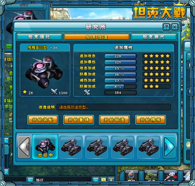 点击游戏界面下方的【坦克】按钮,打开【我的坦克】界面。点击【改造】按钮,进入坦克改造页面。点击下方的【翻页】按钮查看所有坦克,您可通过点击坦克图标来选中坦克。坦克选定之后,你可以点击【开始装配】、【开始重铸】、【开始锻造】、【开始精炼】,来进行强化操作。每种操作都要消耗相应的材料,这些材料可以通过任务获得,也可以在商城中购买。