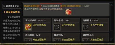 锻造成功将有提示,可以去宝物栏的装备里查看。强化装备是黄金装备里属性普通的装备,往上还有无暇装备、完美装备。