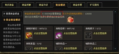 装备升级也分普通和黄金装备升级。普通装备升级只需要消耗铜钱,不过要提高成功几率需要用阴阳符。最高等级目前是+9。