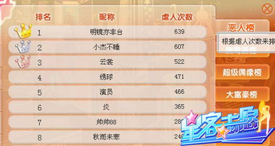 《星客志愿》的排行榜,囊括了各式各样的属性排行,同时也包括了如倒霉蛋榜、恶人榜这些另类排名,占据排行榜可不只是炫耀自己而已哦,每周日24:00,如果你在排行榜中挤进前六名,便可获得相应的排名称号,会有额外的属性加成呢!