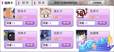 既然是整蛊,就要有整蛊道具。在《星客志愿》的百货店中,出售数十种整蛊专用道具,每种都有特殊效果,只要成功,就可以提升你在恶人榜中的捣蛋次数。当然要是陷害别人失败,还是要受到相应的惩罚,不过相信想冲恶人榜的朋友也不会在乎失败的后果,要将恶人做到底。